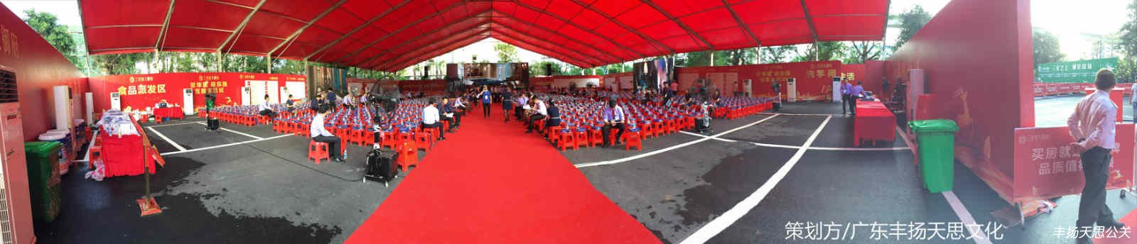 考慮到恒大是世界500強企業,企業實力相當,在布置房地產開盤活動現場時,豐揚天思采取紅色主基調,讓整體的現場看起來十分的喜慶火爆。在進入場館前,有一條長長的紅毯通道,紅毯兩側的宣傳墻都是恒大集團的實力體現,還有開盤樓盤優越地理位置宣傳。這樣的設計,能讓入場參加活動的人員第一時間感受到房地產開發商的實力,更加信賴。