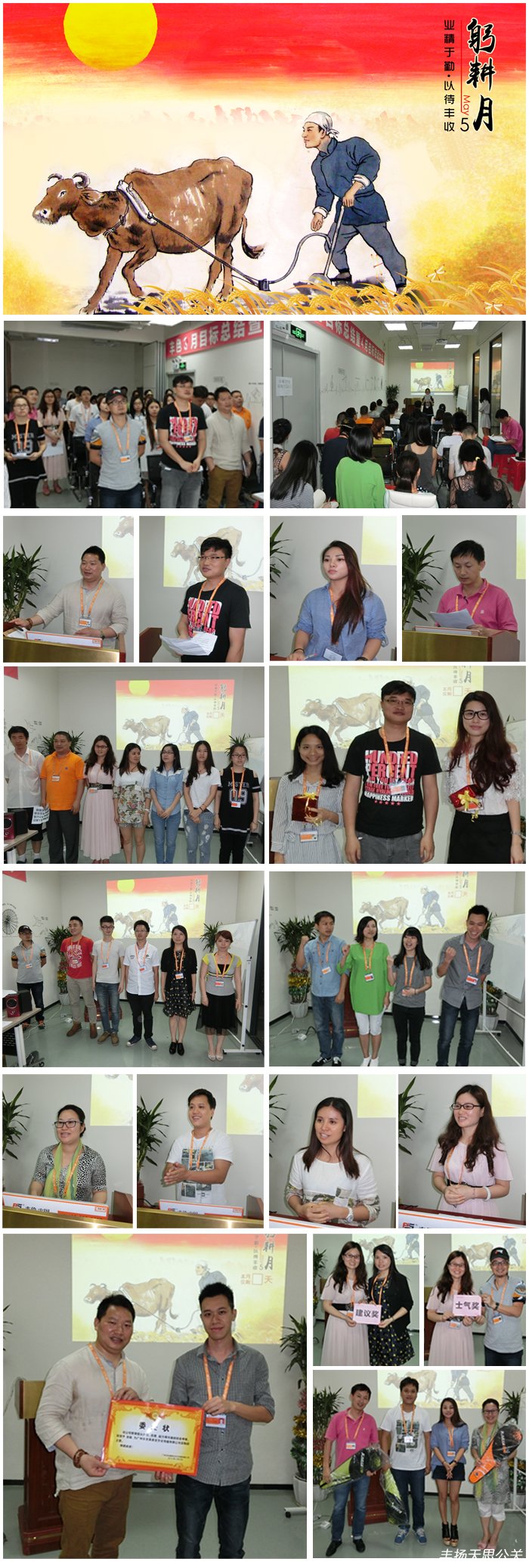 總結(jié)3月、4月的工作成果,確定5月、6月的工作目標(biāo)。2015年5月8日“躬耕月”月度工作總結(jié)暨目標(biāo)啟動(dòng)大會(huì)在廣州總部揭開(kāi)帷幕,公司管理層以及豐揚(yáng)天思廣州策劃公司各事業(yè)部門(mén),創(chuàng)業(yè)部、行政部、財(cái)務(wù)部、采購(gòu)部、后勤保障部、制作部、以及部分加盟、聯(lián)盟、分公司代表等參加了本次會(huì)議。