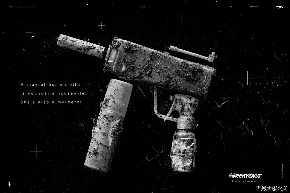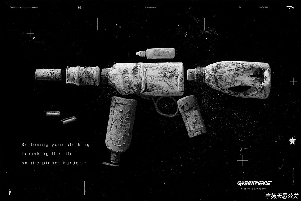 畫面中,由一次性紙杯、包裝瓶、吸管等廢棄塑料制品組成槍支武器的形狀作為主視覺元素,黑白色調的畫面配上字字戳心的文案烘托出壓抑的氣氛,再次用恐怖訴求的表現手法強調了塑料制品對環境的危害,以此提倡人們減少塑料制品的使用,不要成為殺害地球的劊子手。